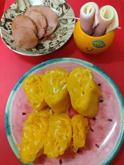 朝ご飯に マヨネーズ入り玉子焼き、焼きベビーハム、ハムのチーズ巻きを朝食で いただきます。様々な食材が値上がりしていますがマヨネーズを活用して料理作りを楽しみたいです(^^)
