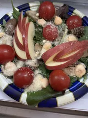 ベビーリーフを敷いてバターでソテーしたマッシュルームを載せチェリートマトをかざり、りんごの飾り切りをデコレーション!マヨネーズとパルメザンチーズをふって召し上がれ!