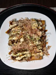 厚揚げのお好み焼きを作りました。焼いた厚揚げの上に炒めた豚バラ肉を乗せて、お好み焼きソース、マヨネーズ、青のり、かつお節をかけました。とっても美味しく頂きました。☺️👍