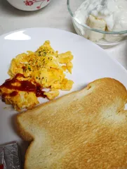 キユーピーハーフを使ってスクランブルエッグ バナナヨーグルトチーム、コーヒー