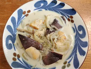きのこと鶏むね肉の豆乳スープ 鶏むね肉にマヨネーズまぶし焼き、きのこ炒める時にも使いました。キユーピーレシピのさつまいもとベーコンのジャーマン風マヨサラダと美味しく頂きました。🌻