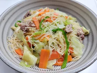 焼きビーフン 焼くときにマヨネーズ使いました。豚こま肉•キャベツ•人参•長ネギ•ピーマンで。美味しく頂きました。🌻