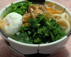 手打ちうどんを作り寝かせている間に、お出汁を作りトッピングも用意しました🧑🍳■トッピング■『新たまねぎ』『にんじん』『大根』『しめじ』『下仁田ねぎ』『油揚げ』『豚ロースしゃぶしゃぶ用』マヨネーズで炒めて、きつねうどんのような甘辛い味に仕上げました。『菜の花』『九条ねぎ』『温泉卵』『ごま』『黒七味』