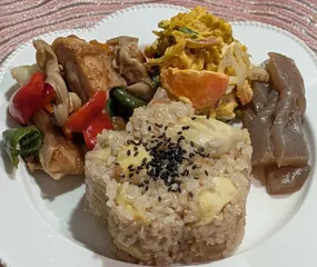 【鶏むね肉とこどもピーマンとパプリカと舞茸の燻製マヨネーズ焼き】 【かぼちゃのサラダ】『かぼちゃ』『にんじん』『赤たまねぎ』『れんこん』『ゆでたまご』『ピーマン』 【こんにゃくの含め煮】 【玄米ご飯とおもちで栗ご飯】