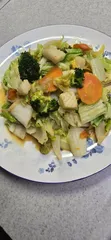 冷蔵庫にお野菜がいっぱい残ったので、イカをトッピングしてマヨネーズハーフでサッと炒め簡単八宝菜風です😆🎵🎵