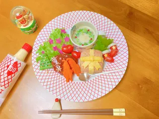 クリスマスごはん𐩢𐩺 ハンバーグ、薄焼き卵、サラダにマヨネーズを使いました。ハンバーグとサラダのおかわりは たくさんありますよー🤗