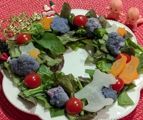 MerryChrirsmas🎄 【リースサラダ】『サニーレタス』『サラダほうれん草』『紫カリフラワー』『ミニトマト』『大根』『ブロッコリー』『にんじん』『胡桃とアーモンドのドレッシング』【クリームシチュー】『たまねぎ』『にんじん』『じゃがいも』『れんこん』『しめじ』『オレンジ白菜』『鶏ささみ』『コーンシチュールゥ』『マヨネーズ』『