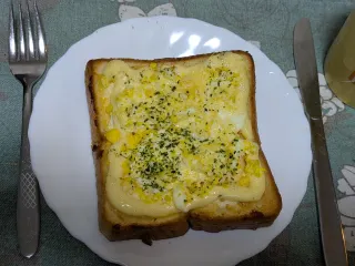 朝ごはん たまごサラダトースト。これでもかってまた縁にマヨ絞る。