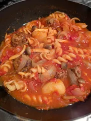 肉団子とトマト🍅のコンソメスープ😀肉団子はマヨネーズを混ぜ込み、丸めて焼きました😆残りがハンバーグになったよ😙笑 いい感じに焼けた肉団子!コンソメのスープにじゃがいも🥔、玉ねぎ🧅、トマト🍅缶、ぶなしめじ、マカロニと一緒に煮込みました真っ赤なスープ🍲😆