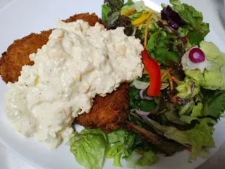 たっぷりタルタルソース キユーピーハーフを使いタルタルソースを作りましたアジフライ(惣菜)にかけて頂きました サラダクラブさんの10品目のサラダレタスやパプリカ に テイスティドレッシング和風 香味たまねぎ をかけて頂きました