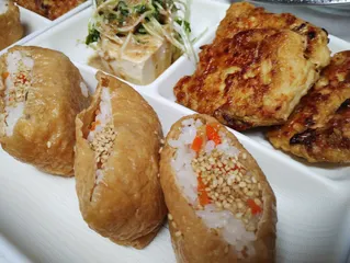 キャベツ入り やわらか鶏つくね キユーピーハーフを使ってキャベツ入り とりつくねを作りました形作りはスープを使ったのでちょっと不格好になりましたが ふっくら美味しくできました 豆腐サラダ(深煎りごまドレッシング にんにく味噌味を使いました ) 五目ちらし入りいなり