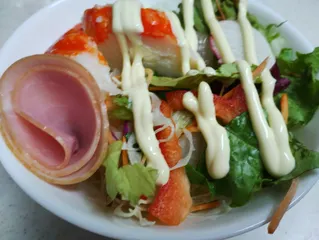 野菜サラダ(キユーピーハーフ) 野菜サラダにキユーピーハーフをかけて頂きました キャベツの千切り、サラダクラブさんの10品目のサラダレタスやパプリカ、チーズカニカマ、ロースハム お昼に檸檬風味のつゆで素麺と一緒に