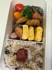 娘のお弁当🍱 今朝、作りました。大学2年の娘は、今、二か所のバイトを掛け持ちしています。今日は、最近始めた短期のバイトに行く日。東京の百貨店のチュコレート売り場です。玉子焼きの卵液にマヨを混ぜました。