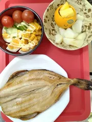 ボリュームたっぷり 焼きホッケ、パイナップル粉ふきいも、玉子とコーンと キュウリとミニトマトのサラダを昨夜いただきました(*^^*)焼きホッケは、すごく食べ応えがあり大満足です😊