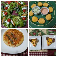 クリスマス 今日はクリスマスイブなので、リースサラダにシーザサラダドレッシングとチキンナゲットには、オーロラソースとアボカド🥑とマヨを使ったソース、ピザ🍕です。デザートはチーズケーキです。 美味しく頂きました。 楽しいイブでした。☺️🎁👍