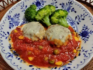 ハンバーグの肉だねにマヨネーズ使い中と全体にとろけるスライスチーズ使いました。ホールトマト缶に玉ねぎなくなっていたので残っていたミックスベジタブルを入れて美味しく頂きました。🌻
