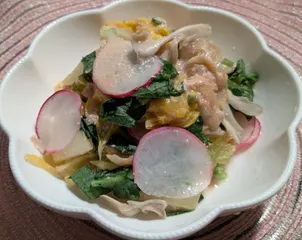 湯葉と野菜と舞茸のたらこマヨネーズ炒めと粕汁♪ 【湯葉と野菜と舞茸のたらこマヨネーズ焼き】『生湯葉』『オレンジ白菜』『ラディッシュ』『舞茸』『たらこ』『マヨネーズ』『昆布とかつおのお出汁』 【粕汁】『たまねぎ』『にんじん』『大根』『ごぼう』『里芋』『しいたけ』『油揚げ』『白ねぎ』『絹ごし豆腐』