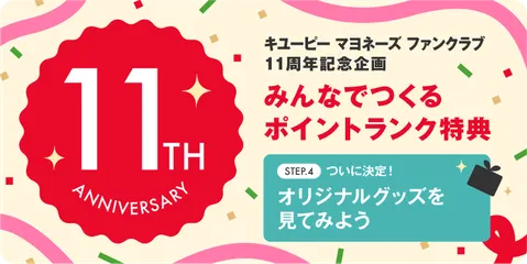 こんにちは、進行役の「えみ」です!キユーピー マヨネーズ ファンクラブは、みなさんのおかげで11周年を迎えることができました。「みんなでつくるポイントランク特典」企画とは、「エキスパート」ランクになった方にプレゼントするポイントランク特典を、みなさんと一緒につくるファンクラブ11周年記念