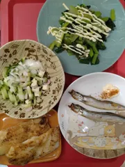 魚づくし 白身魚のムニエル、焼きシシャモ、カマンベールチーズのサラダ、小松菜のおひたしをいただきます(*^^*)