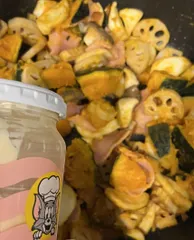レンコン、カボチャ、ハム、しめじをマヨと醤油でソテーしました! 大好物なのです😋✨