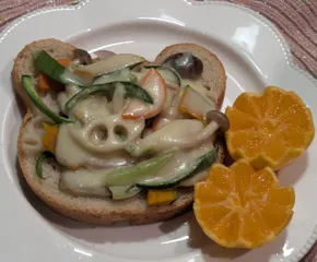 自家栽培シャインマスカット酵母で【くま食パン】を焼きました🍞🧸 今朝は【野菜チーズトースト】を作りました。『赤たまねぎ』『にんじん』『ごぼう』『れんこん』『白ねぎ』『かぼちゃ』『こどもピーマン』『しめじ』『とろけるスライスチーズ』『燻製マヨネーズ』