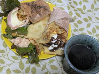 朝昼兼おやつ ハムチーズ、ツナマヨ、チョココーヒー&ホイップのミニクレープ。生地にもマヨネーズでモッチリクレープ。