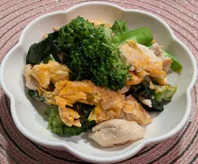 ブロッコリーと鶏ささみの卵炒めと粕汁♪ 【ブロッコリーと鶏ささみの卵炒め】夏の終わりに植えたブロッコリーが大きく実ってくれました🥦少し成長し過ぎたように思います💦蒸したブロッコリーと鶏ささみを炒めて、マヨネーズを入れたたまごでとじました🥚【粕汁】『たまねぎ』『にんじん』『大根』『白ねぎ』『里芋』『れんこん』『しいたけ』『ごぼう』『九条ねぎ