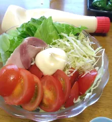 至った平凡なサラダにマヨネーズぶちゅーっと絞りました🥚 これでイイ、これがイイんです!