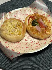 惣菜パン2種焼きましたツナコーン🌽(ツナとコーンをマヨで和えさらにマヨで線描き)野菜とウインナーチーズ(パン生地にマヨを塗り🥦、赤🫑、ウインナーを乗せピザチーズをかけました)焼き立てを美味しく頂きました😋