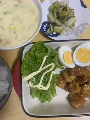 もう恐くなりつつあるサンチュ🥬、でもまだ食べますよ〜マヨにてりてりてりチキンを乗せてがぶり😁甘辛マヨ最高😆