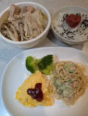 ほたて貝だしの鶏鍋鍋つゆ、鶏もも肉、白菜、えのき茸、ぶなしめじスパゲッティサラダサラスパ、きゅうり、ツナ缶、マヨネーズ、醤油オムレツ卵、マヨネーズ、塩、バター、ケチャップ 梅干しごま塩ごはん🍚 スパゲッティサラダとオムレツにマヨを使いました〜😙オムレツの中はふんわり😆
