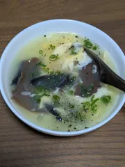 朝ご飯 朝、スープだけ急いで作り食べて出ました。残りのスープは夕飯に。ホタテ貝柱フライにアイオリマヨ、スープのたまごにもマヨ使いふわふわ。