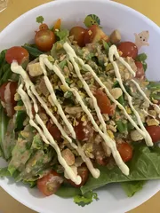 初収穫サラダ 家庭菜園で育てている中玉トマトが収穫できました 早速サラダにしました サラダクラブ北海道コーンもプラス 赤いキャップのマヨネーズ、 家庭菜園のバジルとチャイブをプラスしました 初収穫トマトの味はみずみずしくて甘みと酸味のバランスのよいお味でした