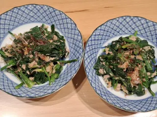 ほうれん草とツナの炒め物 最近よくみかける取り合わせを作ってみました。 炒めるときにマヨネーズを使いました。 仕上げに少しかつおぶしを振りかけて、結石防止に😅
