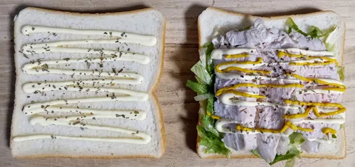 ブランデーに漬け込んで柔らかになったサラダチキンをきざみレタスとマヨパン上に乗せてサンドしてカットして🥪