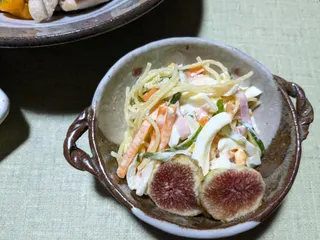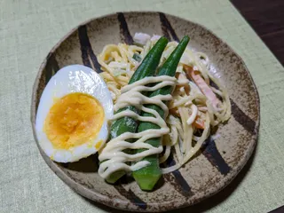 サラダ❓ 昨夜の残りのスパサラに茹でオクラとゆで卵を載っけて追いマヨネーズしていただきました。 昨夜の残り物にお肉を炒めて加えました。カンパチのお刺身、うま塩ピーマン🫑