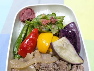 夏野菜から秋野菜へと食材が変わっていますが我が家はまだまだ夏野菜仕様です💦 茄子は夏場たくさん食べましたが秋茄子もまた美味しいです。 赤黄緑のピーマンは無限ピーマンに。 茄子の煮浸し、かぼちゃ煮のあんかけ、オクラとエリンギ茸の肉巻きはレンチン蒸し焼きに、