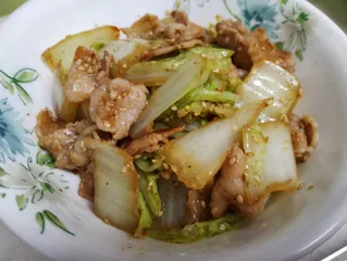 豚バラと白菜のポン酢マヨ炒め炒りごまも加え マヨ炒め〜😊
