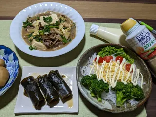 ブロッコリーとミニトマトで隠れてしまいましたが大根サラダです💦 豚バラ茄子、青梗菜のスープ、柚子大根。
