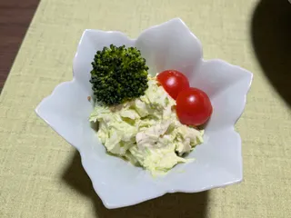 クリームシチュー(炒め油の代わりにキユーピーハーフを使用)蒸しキャベツのピーナッツ和え(キユーピー3分クッキングピーナッツ和えの素を使用)野菜サラダ(和風醤油ごま入ドレッシング)
