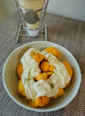 色鮮やかなカリフラワー 小房に分け、レンチンしてもきれいなオレンジ色はそのままでした!ハーフマヨたっぷりに少々のハーブソルトかけて😋美味しかったです