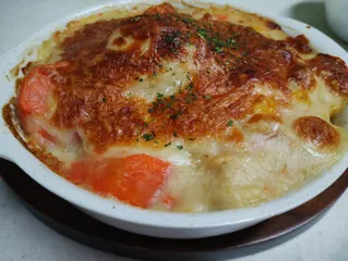 ドリアにリメイク クリームシチューをドリアにリメイク(グラタン皿にバターの代わりにマヨネーズを塗りました)茶巾たまご/大寒豆もやしのおかかポン酢掛け