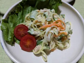 スパサラとツナマヨおにぎり🍙にマヨネーズおにぎりにすると食べ過ぎてしまいます💦