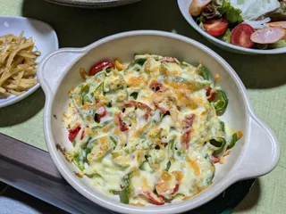 冷蔵庫の奥に追いやられて残っていた菜園のピーマン、まだ残っていたのかと引っ張り出してマヨネーズとチーズを載っけて焼きました。