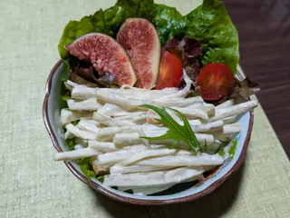 大根サラダ おでんもいいなぁと一本買った大根、作る前に無くなりそう💦千切り大根(スライサーで千切り)、水菜、ツナ缶。撮る角度を間違ってメインが無花果になってしまいました😅