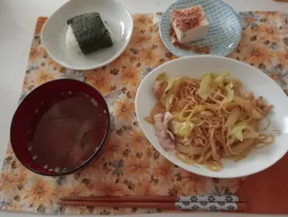 キユーピーマヨネーズで焼きビーフン きょうのお昼に作りました。キユーピーマヨネーズで炒めた焼きビーフン(豚バラ肉、玉ねぎ、キャベツ)おにぎり(梅干し)、冷やっこ、みそ汁です。豚肉と野菜をキユーピーマヨネーズで炒めてカレー粉と醤油少々で味付けしてます。マヨネーズマジックで美味しかったです。