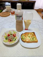 ピザトースト&サラダ ピザトーストはパンにマヨネーズをたっぷり塗って野菜・チーズを乗せて焼きました サラダは焙煎胡麻ドレッシング&マヨネーズ