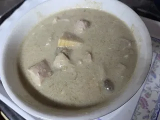 グリーンカレー タケノコ、しめじ、鶏肉でグリーンカレーを作りました。コクを出すために、隠し味にマヨネーズを使っています。おいしいですよ😋