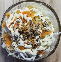 マスタードシードとキユーピーハーフでまぶしたコールスローをサンドして
