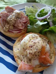 生サーモンのエッグベネディクト マヨを使ってソースを作りました。ポーチドエッグもどきはレンチンで、お刺身の残りで1番下にはチーズ入り😋
